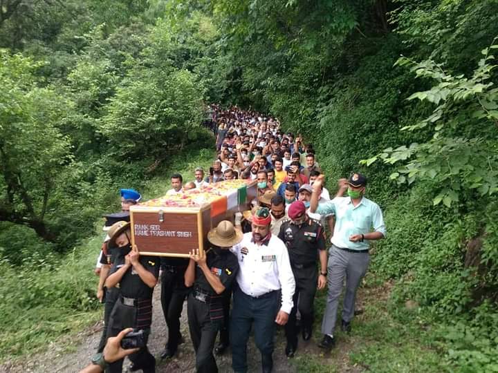 जम्मू-कश्मीर के बारामुला में आतंकियों से मुठभेड़ के दौरान शहीद हुए जवान प्रशांत ठाकुर का आज उनके पैतृक गांव में अंतिम संस्कार हुआ , शहीद की अंतिम विदाई के शोक में पूरा क्षेत्र डूबा रहा। शहीद की अंतिम यात्रा में भरी संख्या में लोग अंतिम विदाई देने पहुंचे।
