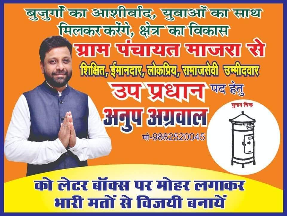 माजरा पंचायत से समाजसेवी अनूप अग्रवाल उप प्रधान पद के लिए लोगों की पहली पसंद बने हुए हैं। अनूप अग्रवाल की युवा सोच और विकास का वीजन उन्हें सबसे आगे रखे हुए है। युवाओं सहित बुजुर्गों के सहयोग से अनूप अग्रवाल उपप्रधान पद के लिए प्रबल दावेदार माने जा रहे है।